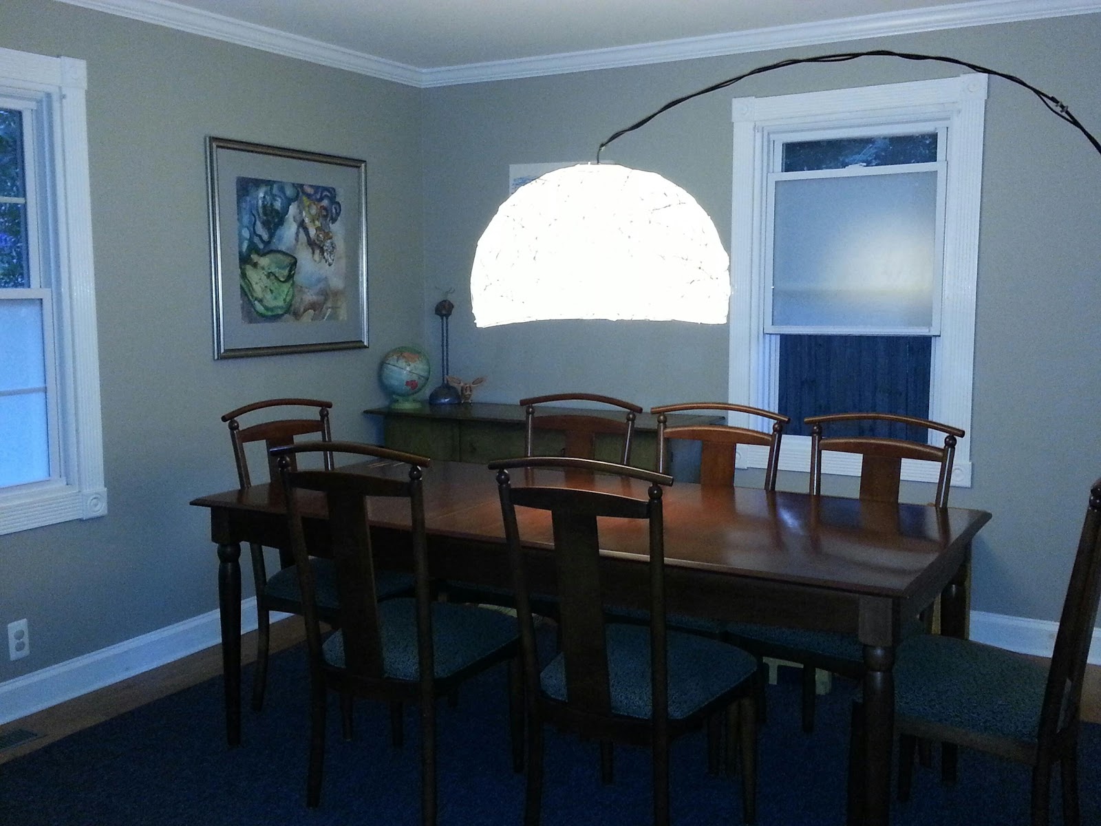 So the images above are clearly of the new dining room. The lamp is the DIY project in question... when you take a room not designed to be a dining room (and with poor lighting in general) and make it a dining room, you are unlikely to have the electrics in place to hang a fixture over the table. Ikea makes this great cantilevered lamp, which we ended up getting from Freecycle. Mr. Unwired had to do a bit of engineering to replace a broken piece, which he did and it's awesome. My job was to repair and jazz up the lampshade, which was torn and boring. Which is the rest of this post.